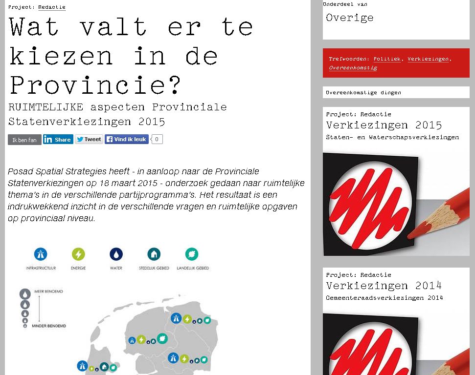 In Noord-Holland lopen de politieke standpunten omtrent goederenvervoer en nieuwe woonwijken erg uiteen. In Friesland zijn de plannen voor windenergie concreter dan in andere provincies. Alleen in Zeeland wordt kernenergie genoemd als thema. In Utrecht is het debat rond de ontwikkelingen binnen stedelijk gebied het levendigst. In Gelderland en Flevoland worden concrete plannen gemaakt voor alternatieve vormen van dijkversterking (waterberging). In de aanloop naar de Provinciale Statenverkiezingen op 18 maart 2015 heeft Posad Spatial Strategies in opdracht van Architectuur Lokaal alle 172 partijprogramma’s uit 12 provincies onderzocht op ruimtelijke thema’s. De resultaten geven inzicht in allerlei vragen en ruimtelijke opgaven – op zowel abstract (landelijk) niveau als op provinciaal niveau. Waar kan uw stem het verschil maken?